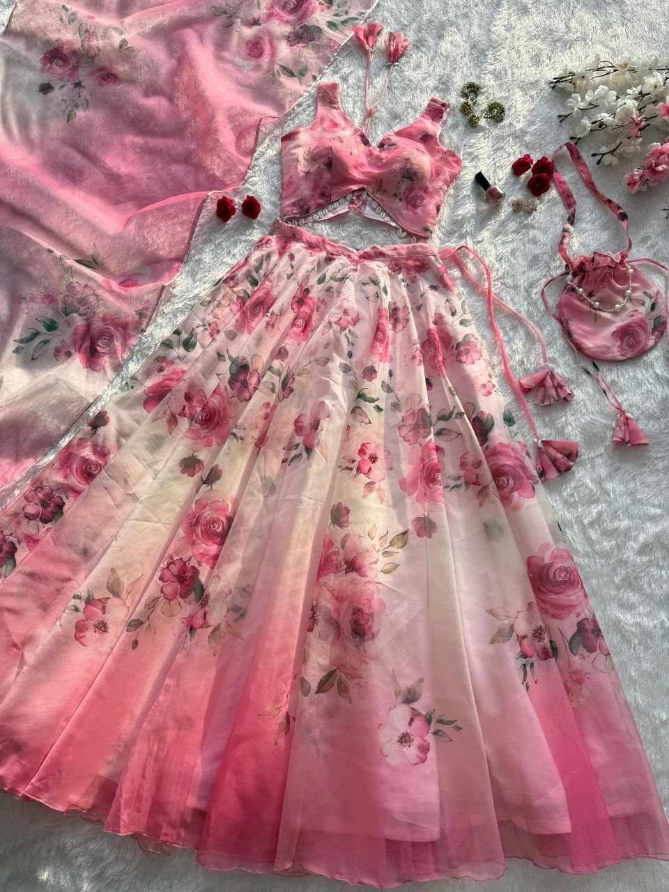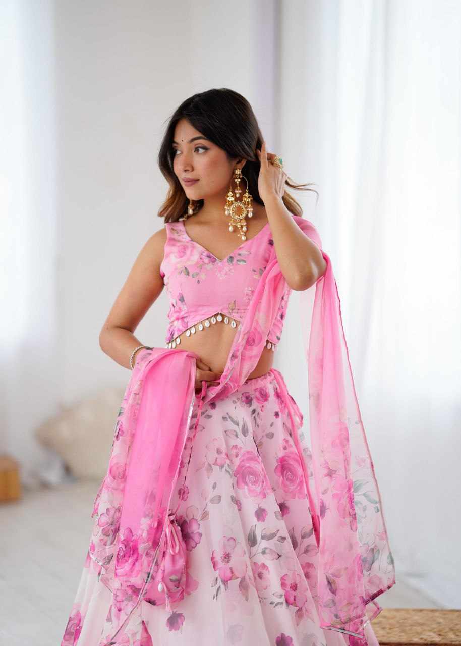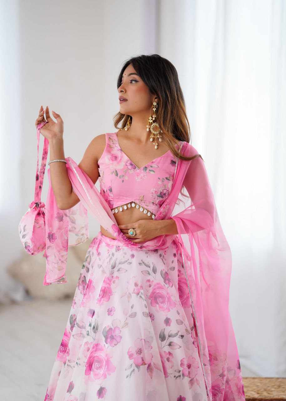 Lehenga – Pure organza silk digital printed lehenga with a grand 8-meter flair. Finished with canvas patta for a perfect flare
