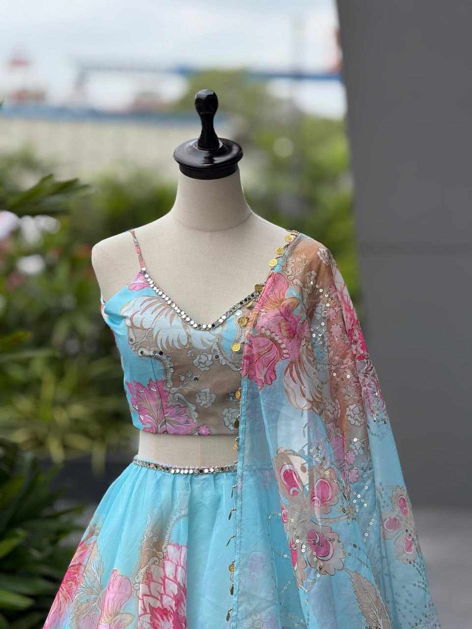 Lehenga – Pure organza digital printed lehenga with a grand 8-meter flair. Comes with canvas patta and adjustable waist dori for a perfect fit